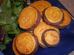The sweet potatoes took half an hour but were so worth the wait. Slice into 1/2″ wedges, brush with a little bit of Extra Virgin Olive Oil and salt, cook on 350 for 15 then on 400 for 15, turning half way through each 15-minutes baking interval.