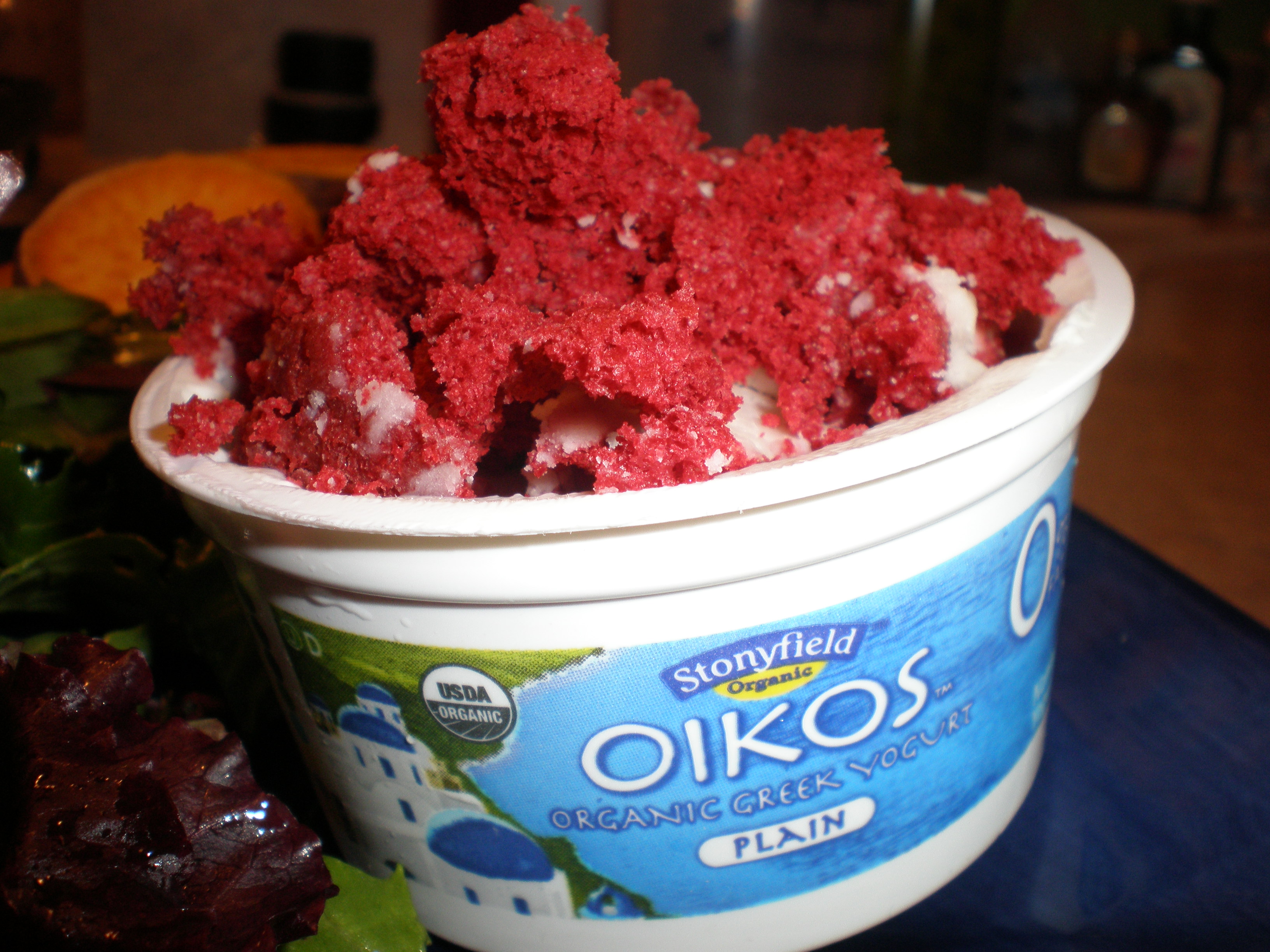 Yes, that is Greek yogurt topped with 1/4 of a red velvet cake donut (Mom, you are a bad influence for buying me this!)