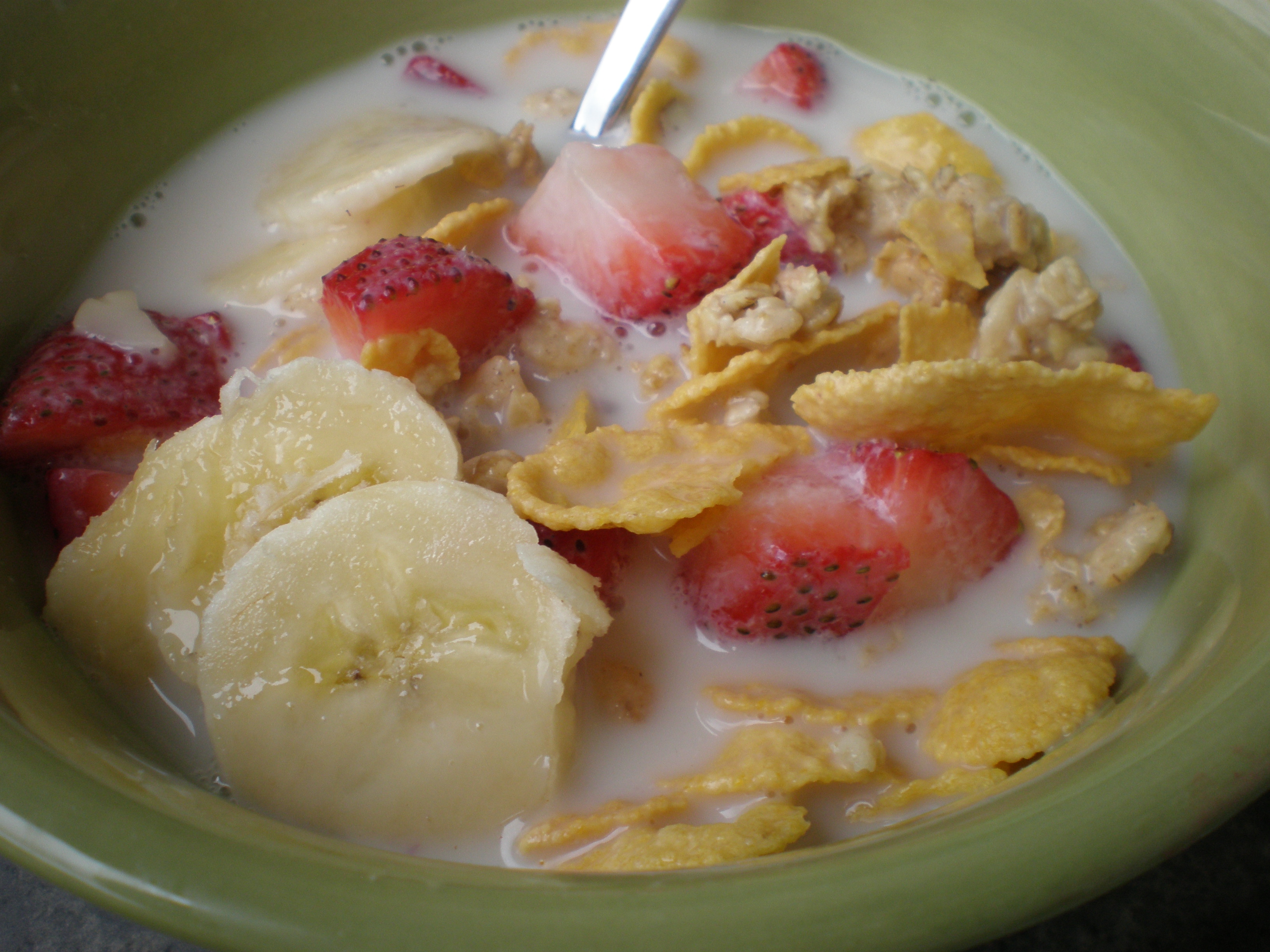 Loved the big flakes and giant granola clusters (whenever I eat Honey Bunches of Oats I waste 5 minutes digging through the box for the big bunches!). Added a few strawberries and some banana slices = peaceful perfection! Oats, you are delicious but sometimes a cold bowl of cereal really hits the spot. Used up the rest of my vanilla almond milk 😦 MUST GET MORE!