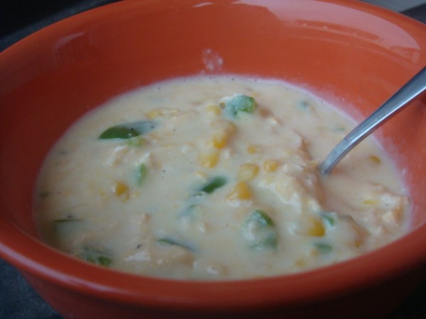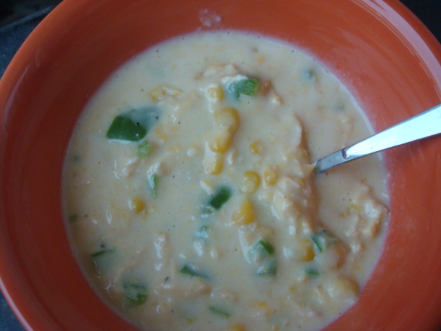 It’s been super rainy ALL weekend, bleh 😦 so I was really craving a creamy soup for dinner. Joey found a recipe for Potato Soup last week that I thought looked really good… with one exception…the potatoes! I was not in the mood. I was, however, in the mood for some corn (as always). I used a mixture of this recipe AND this recipe and ended up with my own soup.