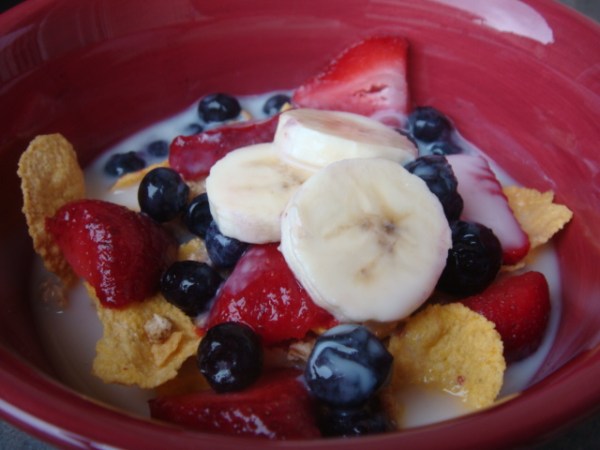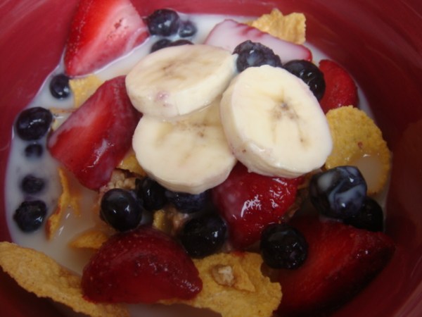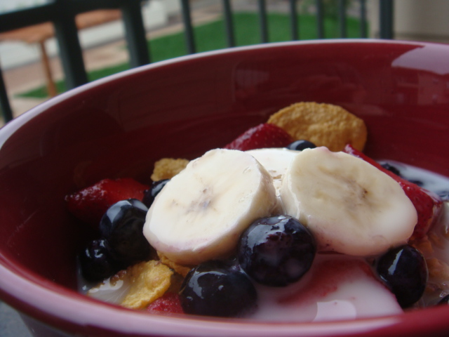 With thawed frozen blueberries and strawberries and a few pieces of banana that wouldn’t fit on the PB & B samich I packed for lunch.