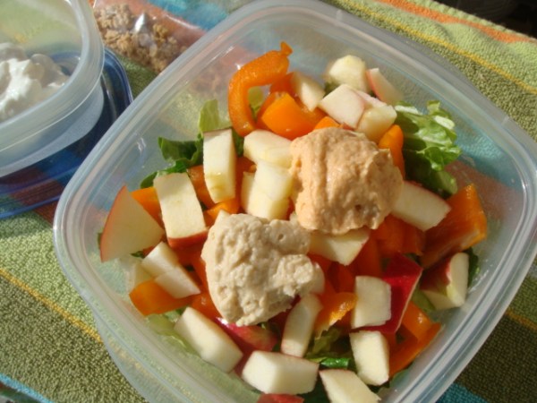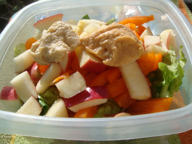 Lunch included this salad with romaine, orange bell pepp, apple and 2 hummuses