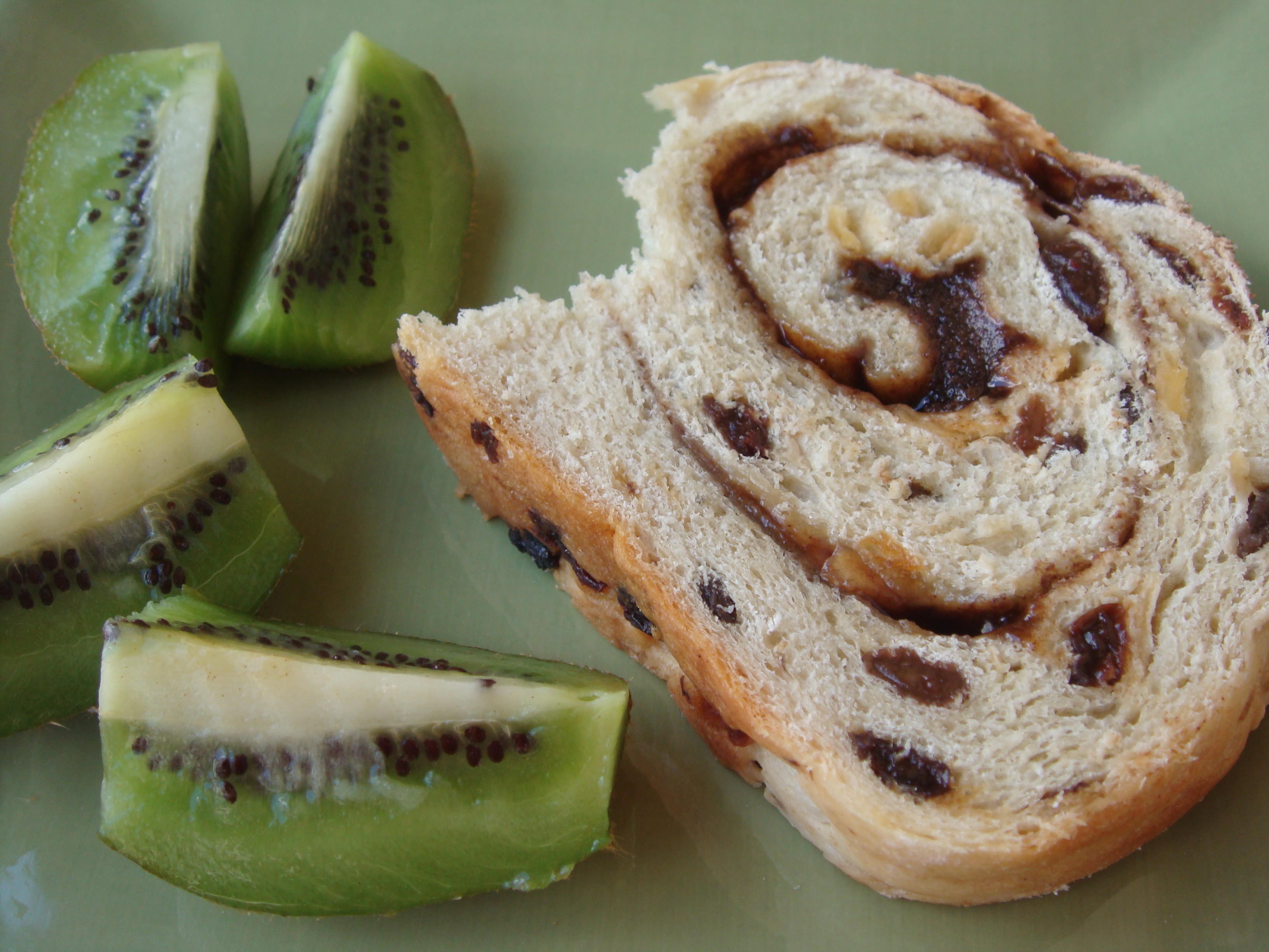 GM was drank drunk (thanks, Mom) alongside this plate of kiwi and bread and OH.MY.GOD. this bread is HEAVEN! We will have no trouble finishing this up.