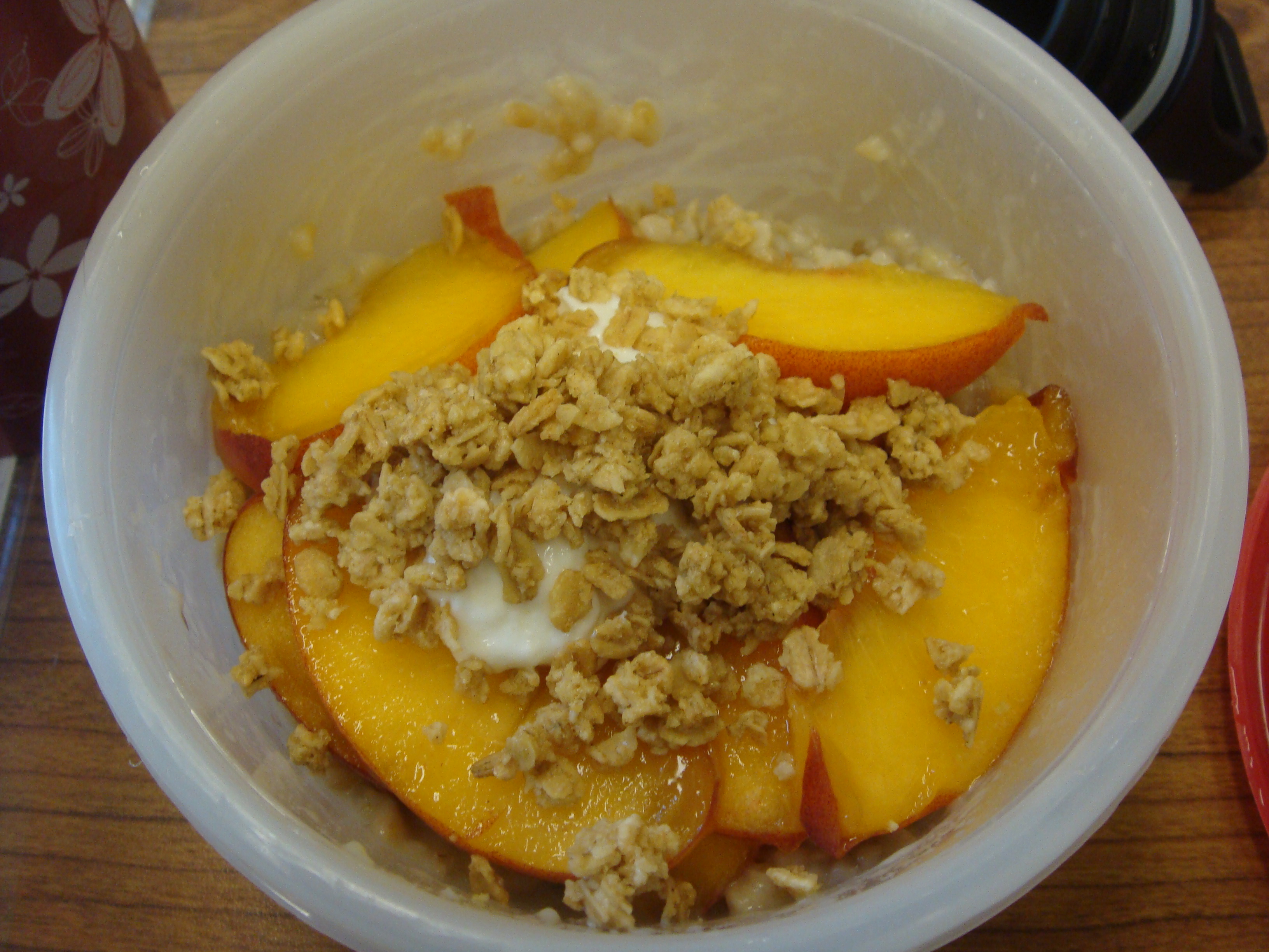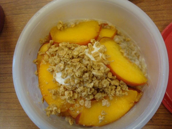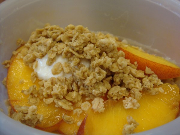 - Package up 1T granola (Just Bunches), 1T yogurt (Honey Noosa) and thin slices of 1/2 a peach