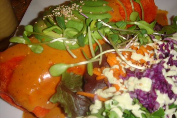 Feast your eyes on the “Famous Tempeh Taco.” Sprouted grain tortilla topped with a tempeh and quinoa mixture and a pile o’ purple cabbage, carrots and greens. The whole taco is drizzled with cilantro dressing with salsa on the side.