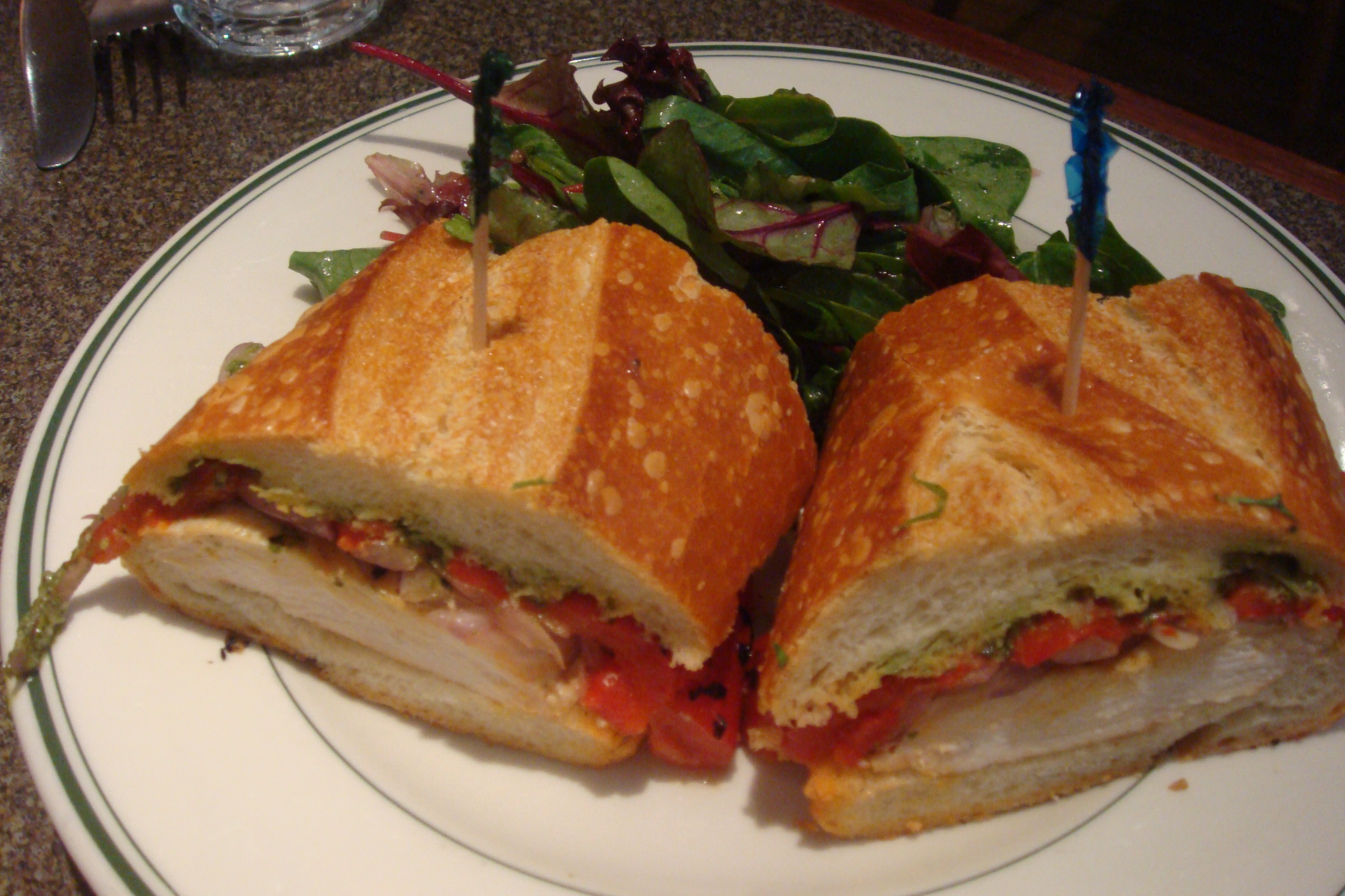 Joey LOVED his! He got the Sally Sanford – chicken, roasted red bell pepper, pesto and red onion on sourdough with greens on the side.