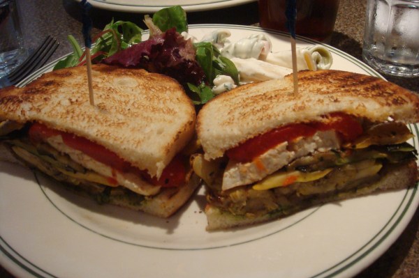 I got the Vegetarian Grille – veggies & tofu on sourdough + pesto and a side of greens and pasta salad.