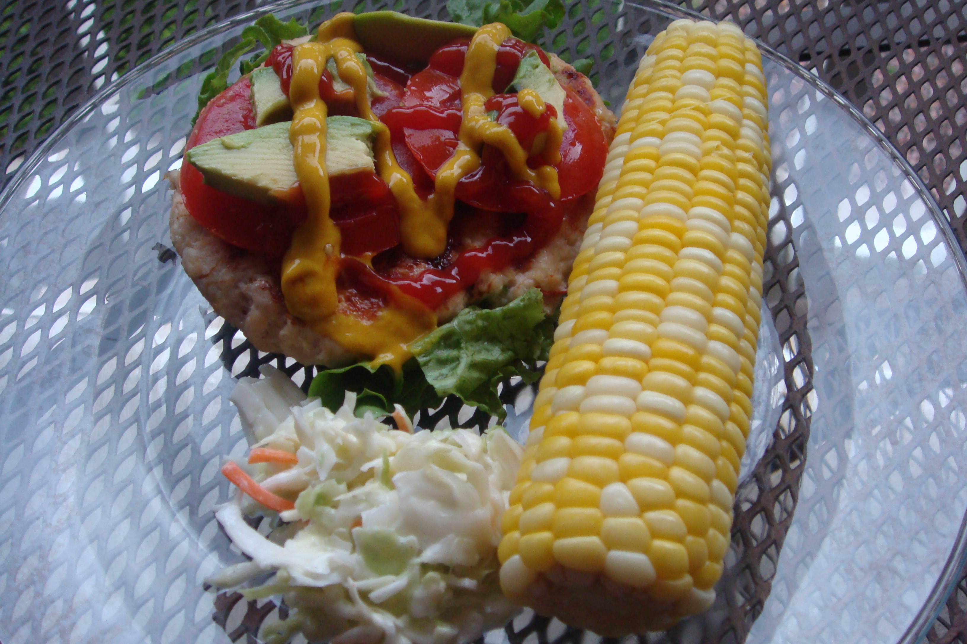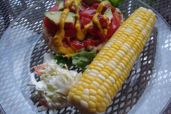 Burger atop lettuce, topped with ketchup, mustard, tomato and avocado.  Plus coleslaw and corn on the side.  I must admit chicken burgers are a little too dry for my taste and the corn was lacking in the flavor department, BUT the company more than made up for it 😀
