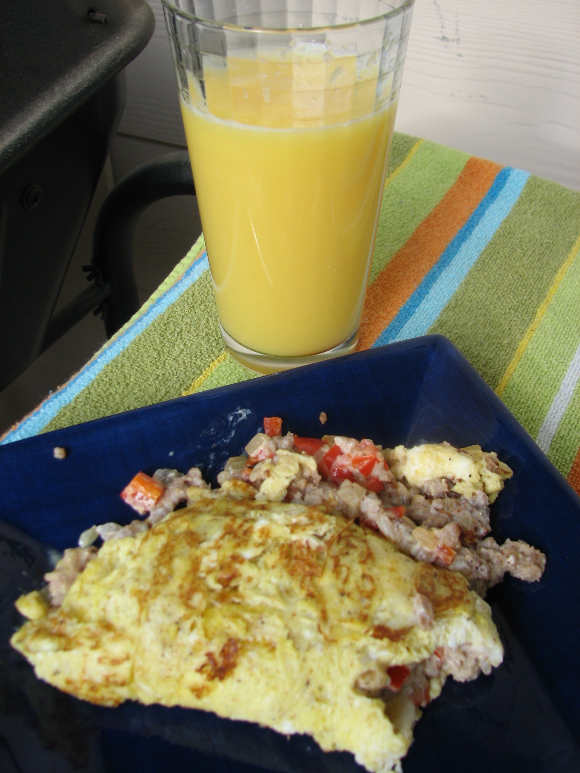 This was kind of an omelete…It came together more like an egg taco, if there is such a thing! The ingridients inside are sausage, onion, red bell pepper and sour cream. Pretty simple to make and tasted fantastic. Oh and a wonderful glass of medium pulp OJ!