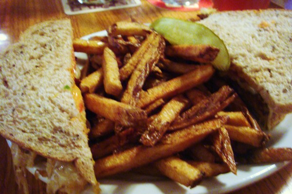 Tempeh Reuben = beer baked tempeh, sauerkraut, vegan 1000 Island Dressing, tomato, swiss cheese. It also came with the pub’s famous fries. Apologies for the amount of blur, apparently I could not hold still!