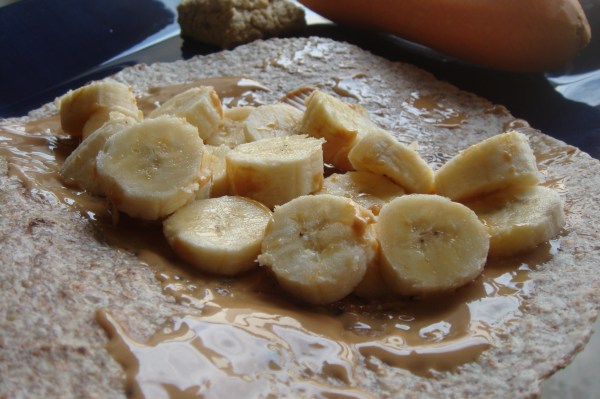 My last Ezekial wrap microwaved for 30 seconds then smeared with PB and banana + carrot and hummus on the side