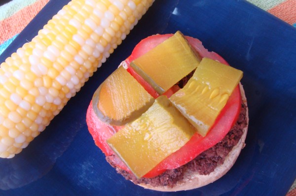 Popped these in the oven on 350* for 20 minutes on each side and voila — topped with mustard, tomato and pickles. I thought the pickle made this burger!