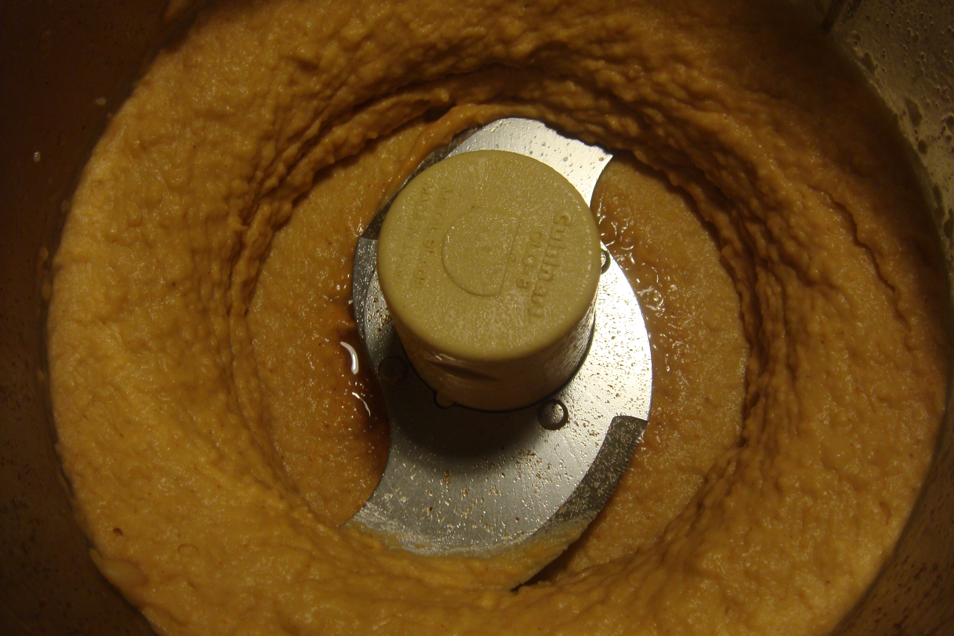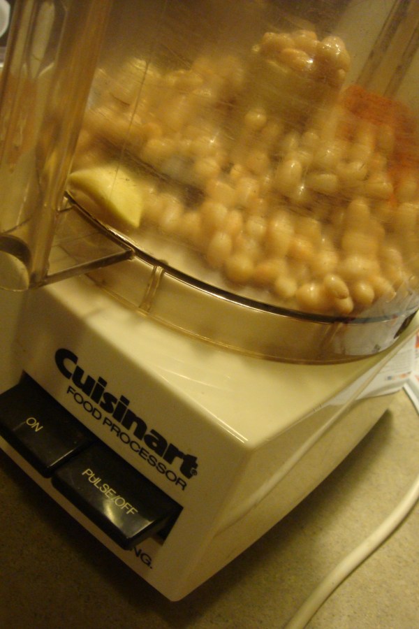 Meanwhile process 2 cans of navy beans (or 1 can if that’s all you have) + 5 cloves of garlic + 1 tsp each of salt and paprika.