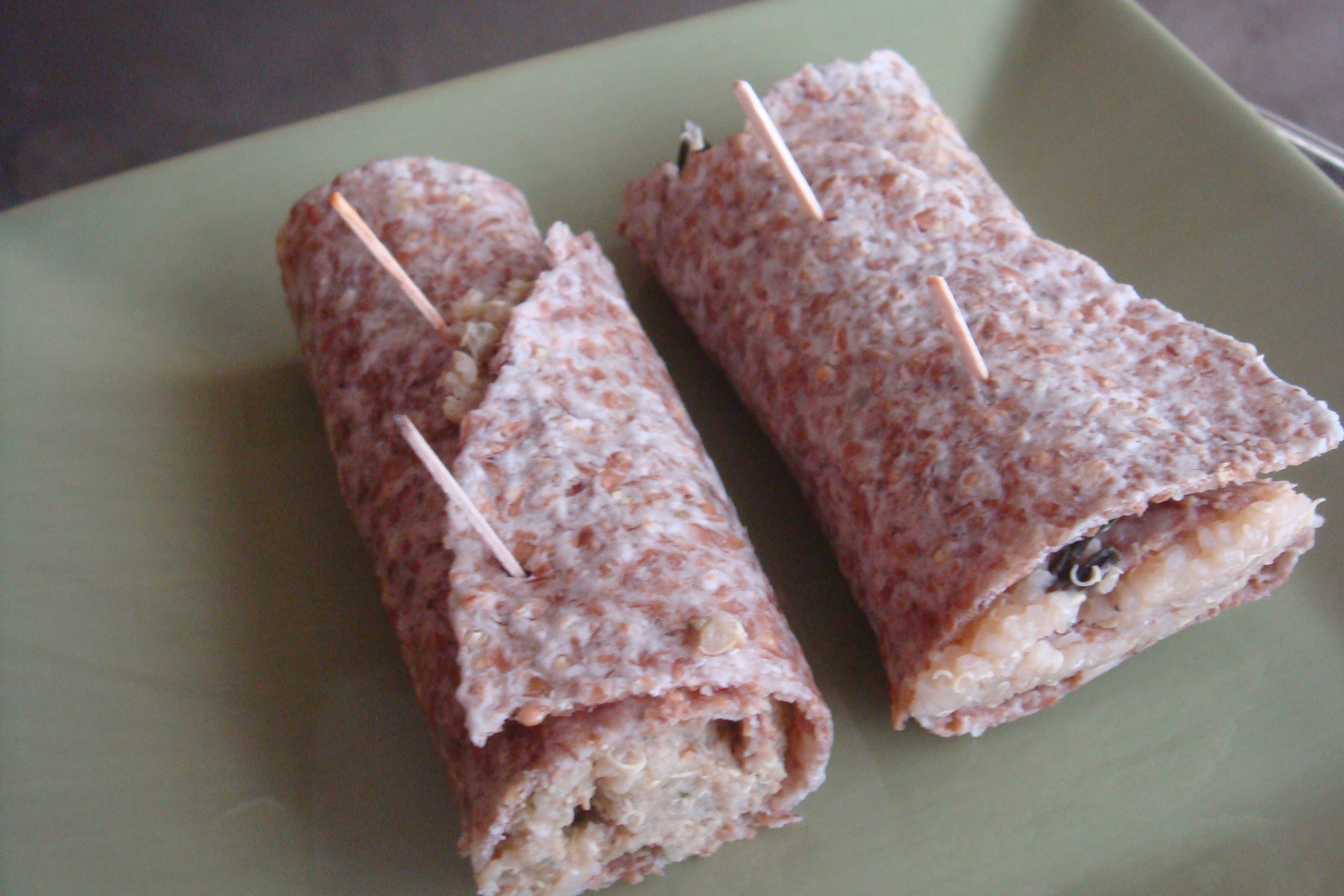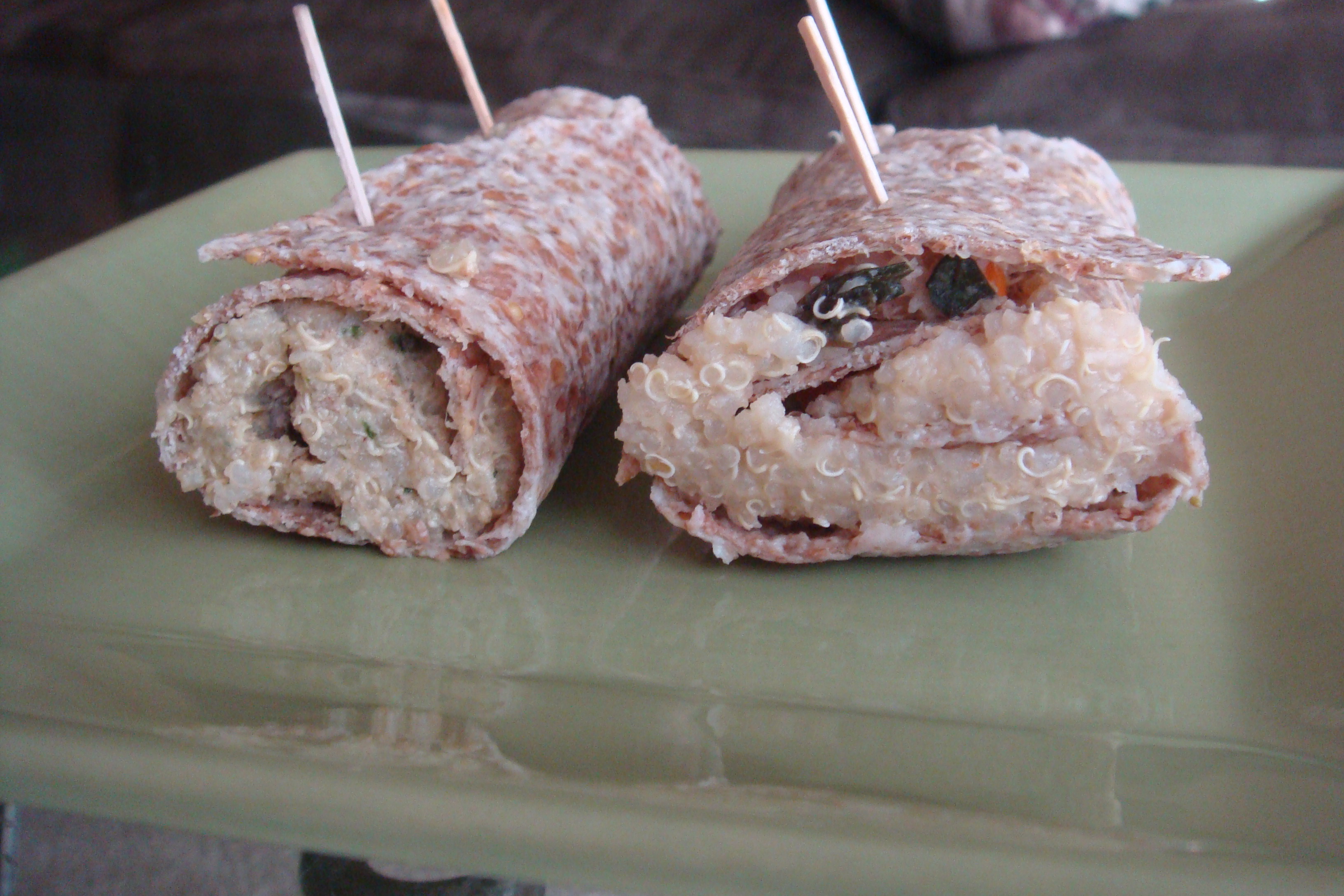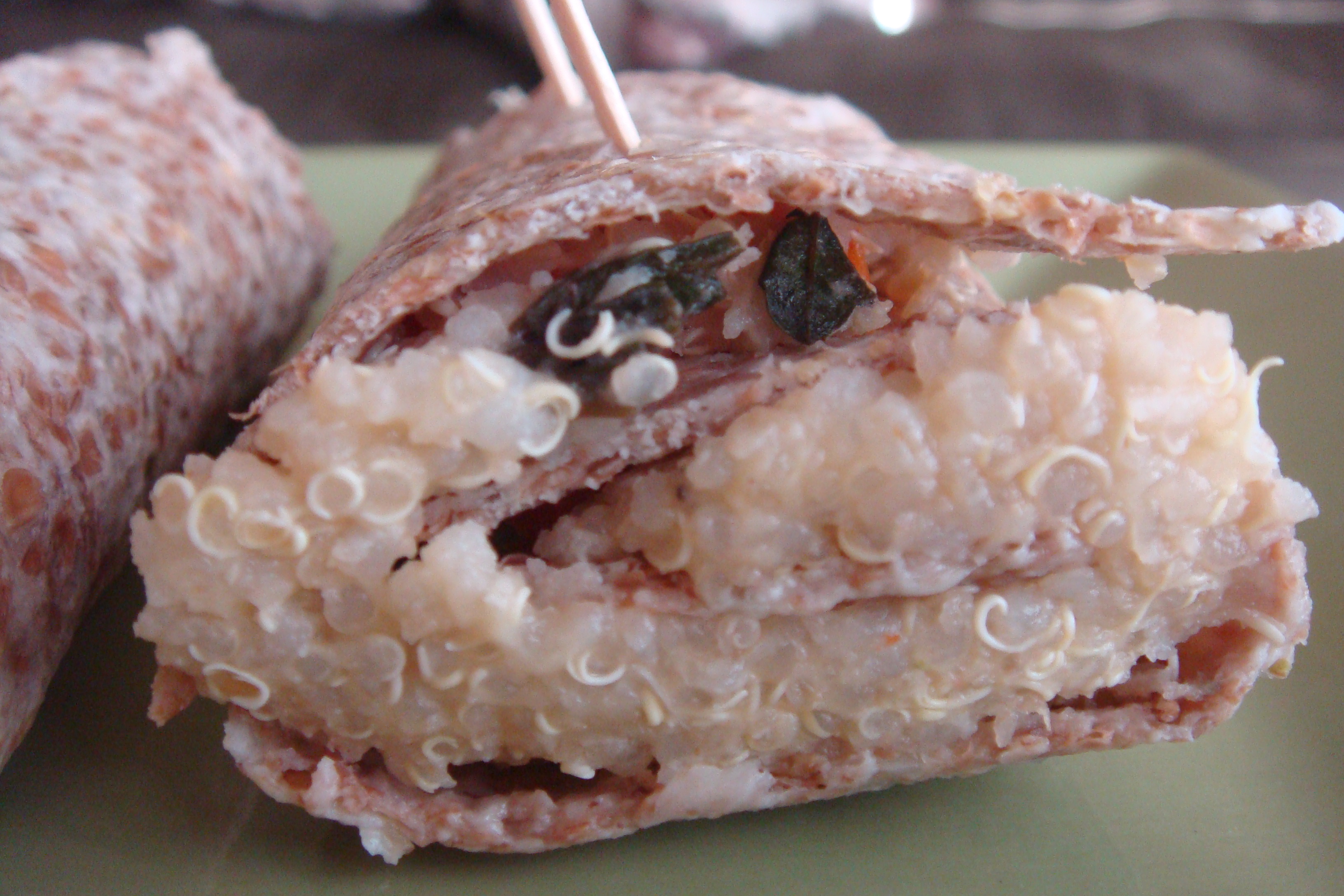 I made these by cooking 1/4 cup quinoa, then splitting it in half and mixing one with pesto and the other with tomatoes, basil and hummus.  I then cut an Ezekial wrap in half, spread one half with pesto quinoa and the other with hummus pesto then rolled them both up.