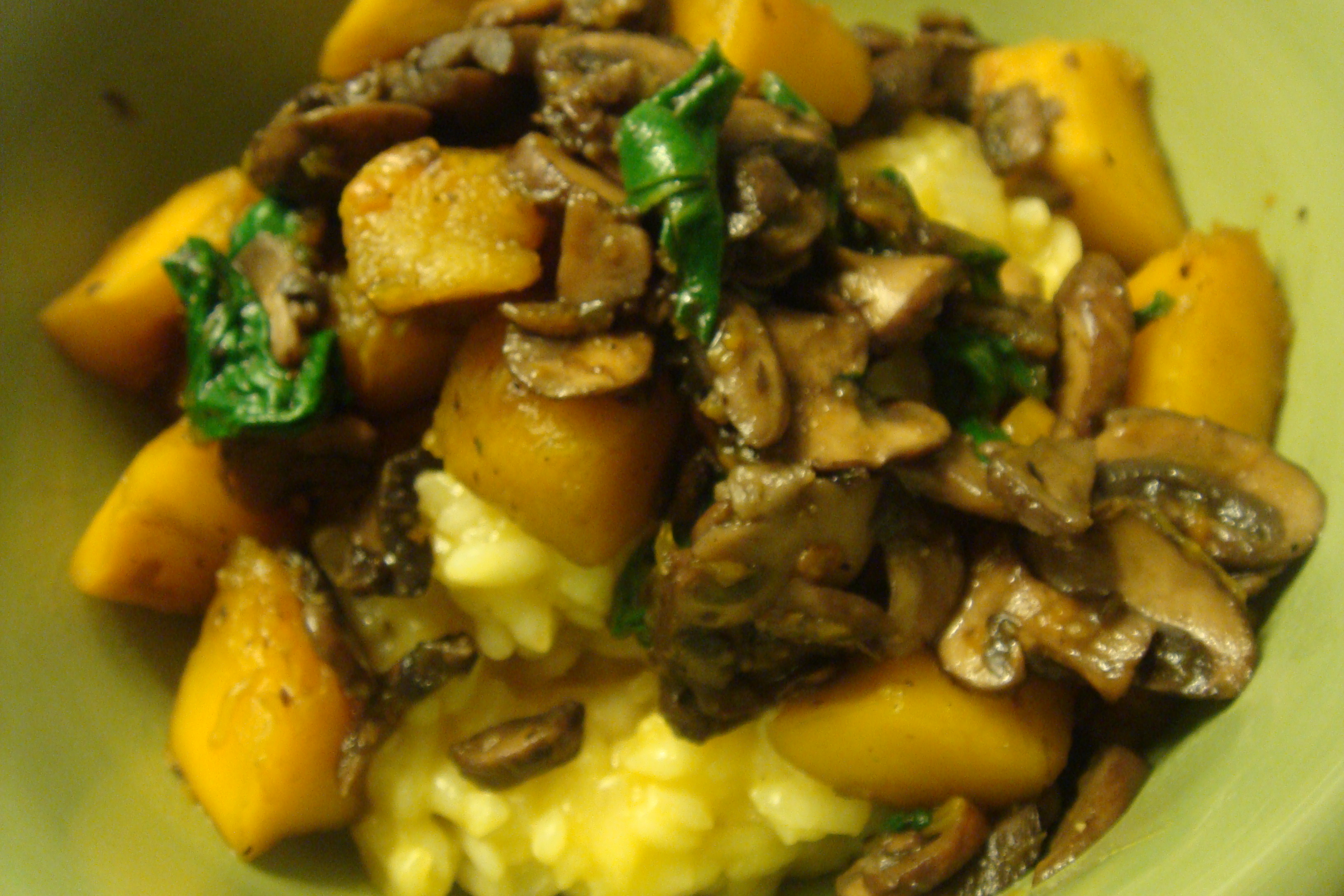 Final step: Top the risotto with the mushroom/squash mix plus a dash of thyme and parmesan if you have it one hand (we didn’t, of course).