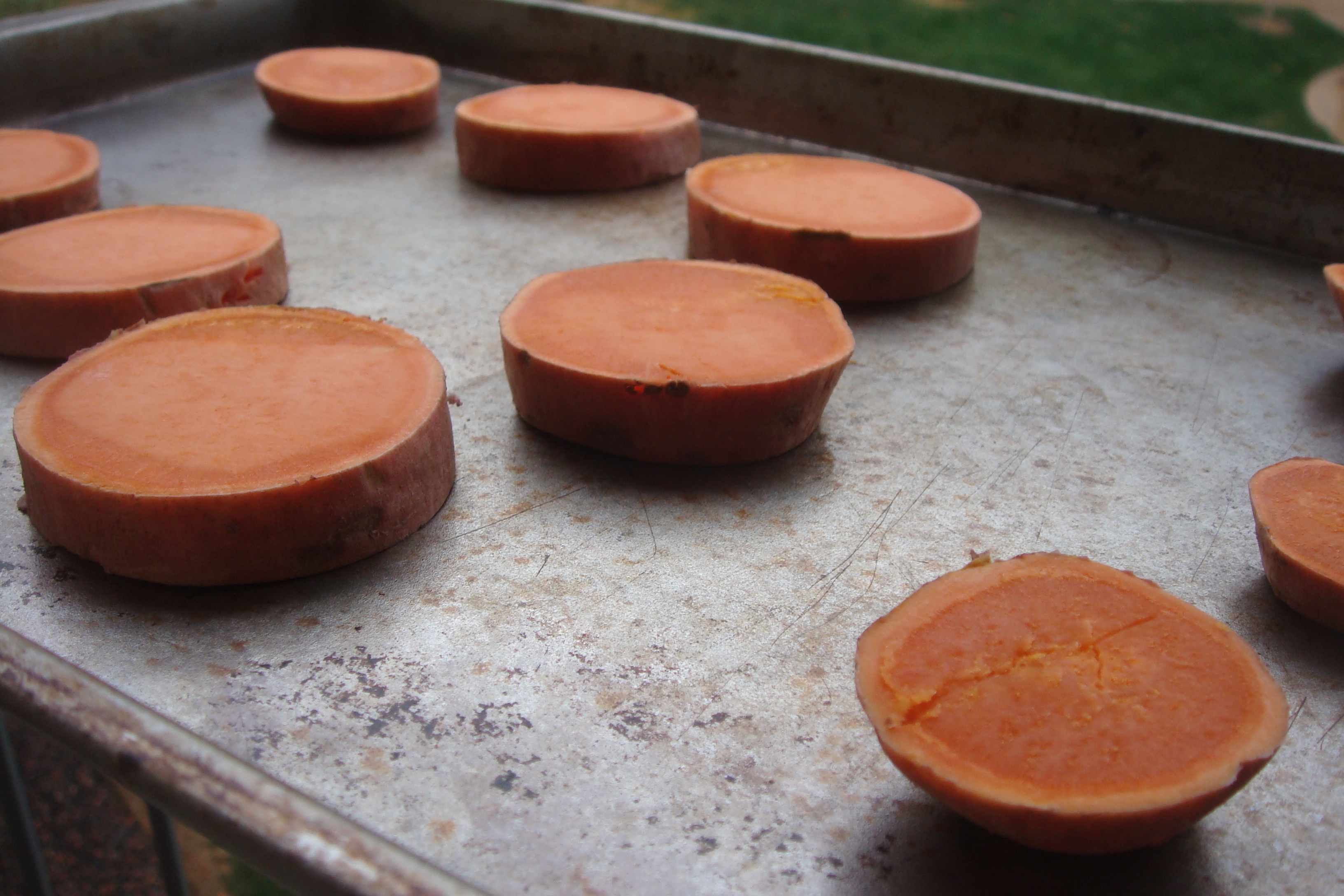 I microwaved the tater for 2 mintues to give it a head start then sliced it and threw it in the oven for 8 minutes on each side. Covered in just a little olive oil + salt and pepper.