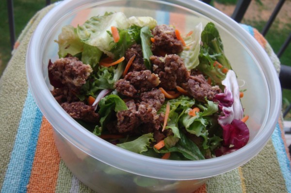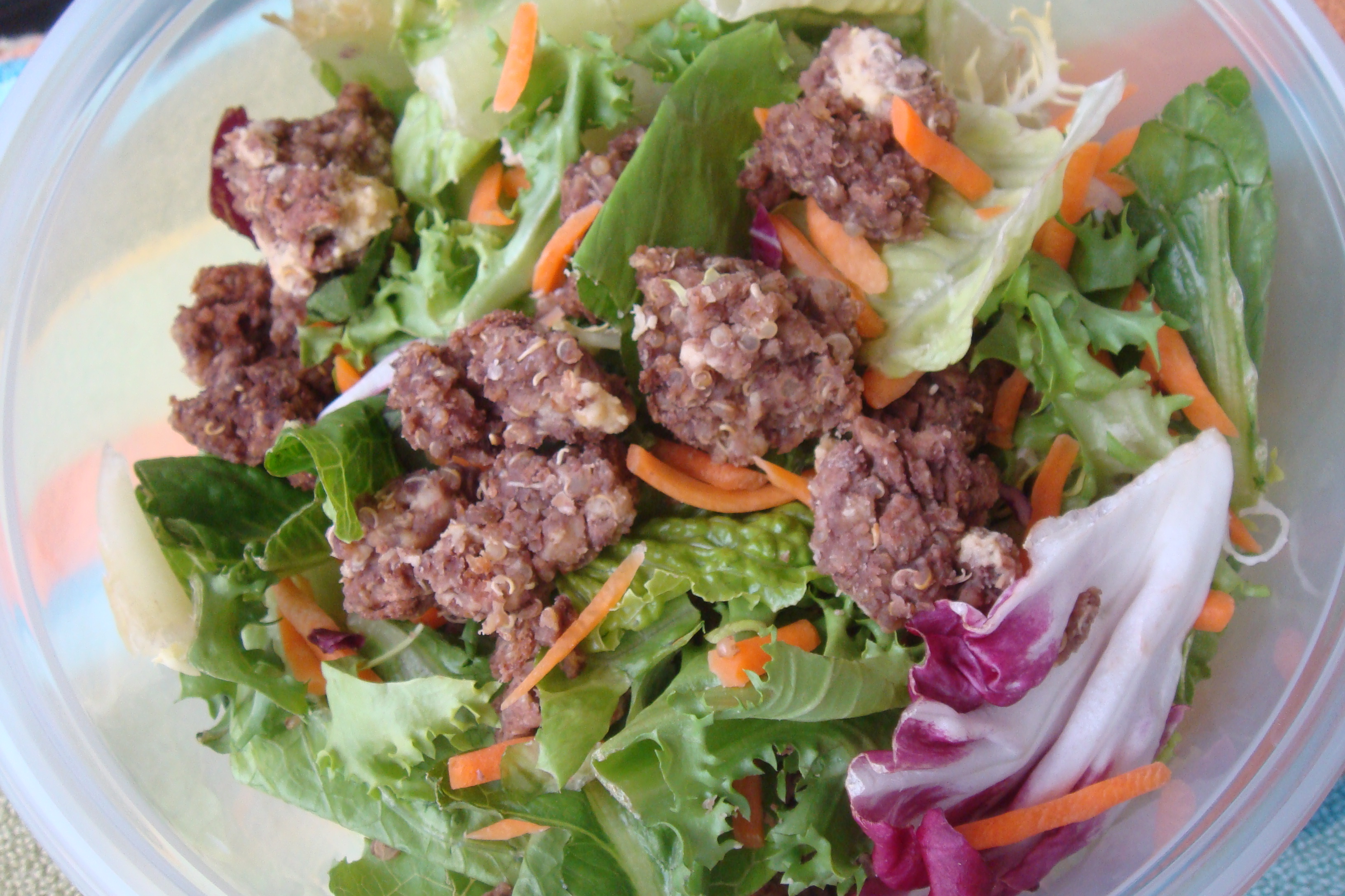 Inspired by Beanie’s quinoa salad I decided to break up a leftover “cheese” stuffed bean burger over some lettuce.
