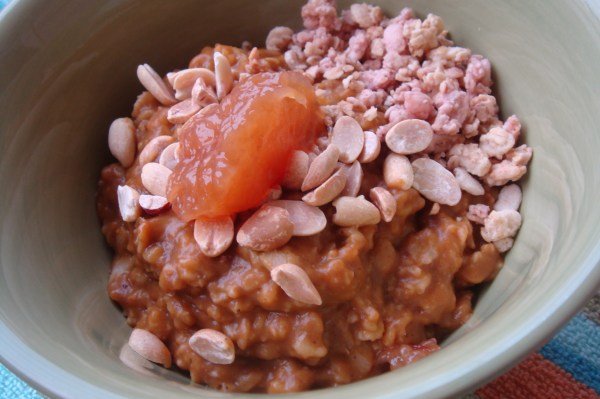 Usual pumpkin oat mix-ins topped with cherry vanilla granola, peanuts and peach jam.