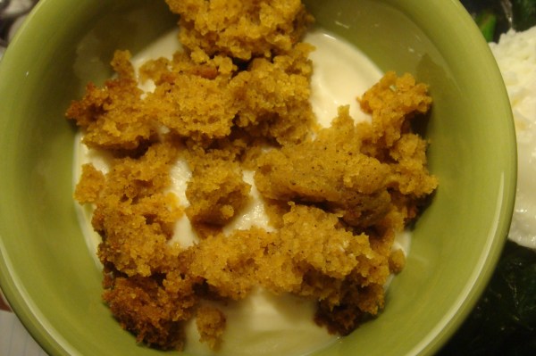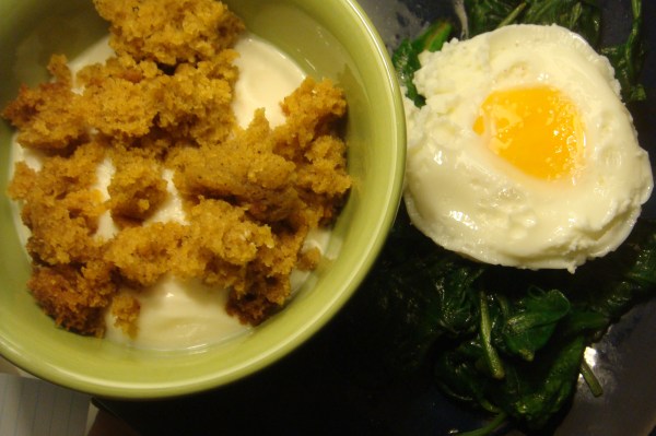 I decided to sautee some spinach in olive oil, salt and pepper then I microwaved an egg for 50 seconds and plopped it on top my greens. Plus Brown Cow vanilla and the other half of my crumbled piece of pumpkin bread.
