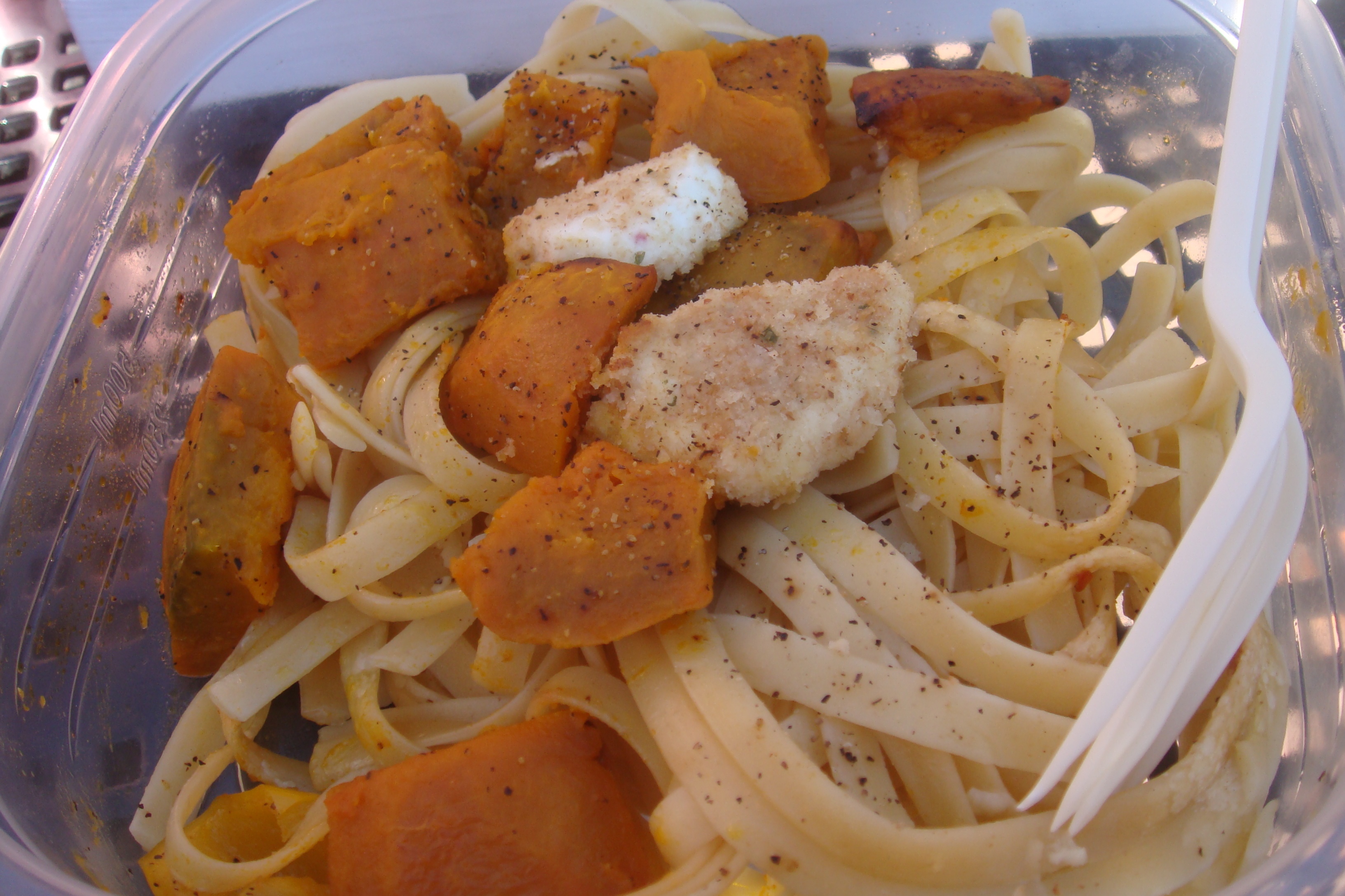 Joey made Baked Goat Cheese and Roasted Winter Squash over Garlicky Fettuccine (whoa, Cooking Light, a little long of a name, don’t you think?) on Wednesday and was kind enough to portion out the leftovers so all I had to do yesterday was grap the container out of the fridge and toss it into my bag for lunch. SA-weeeet.