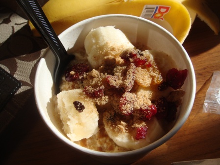 Oatmeal + banana, brown sugar, dried fruit and an encouraging note.