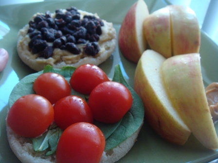 English muffin with hummus, black beans, spinach and cherry tomatoes + apple and peanut butter on the side.