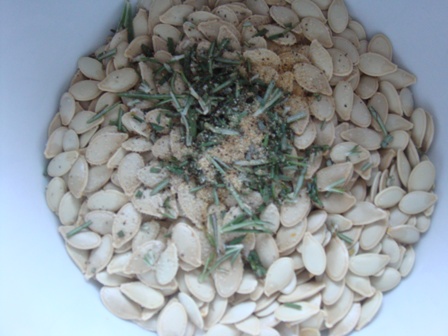 We used Ashley’s amazing Rosemary Garlic Pumpkin Seeds recipe (except we halfed everything since we only had 1 cup of seeds).