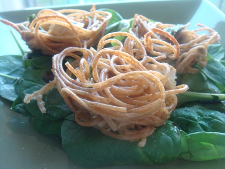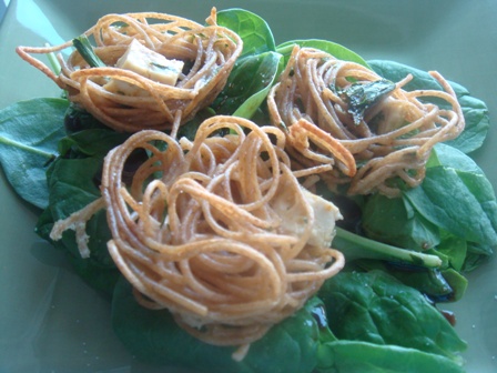 The only problem was we don’t have egg rings or biscuit cutters so I decided to make the patties mini by cooking them in a muffin pan in the oven. I baked them on 350* for ~17 minutes (no flipping like in the original recipe). They came out more like nests than patties but I thought they were pretty darn cute. Cleaning the muffin pan out was not so amusing, however.