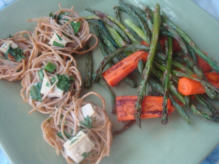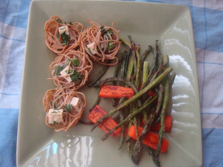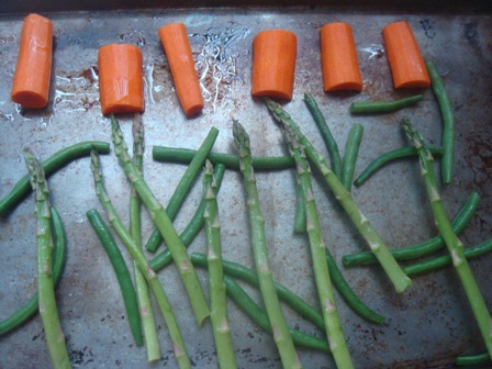 Roasted carrots may be one of my new favorite things.  Although that’s not really fair because I over roasted the asparagus and green beans and they were more like shriveled veggies than roasted.