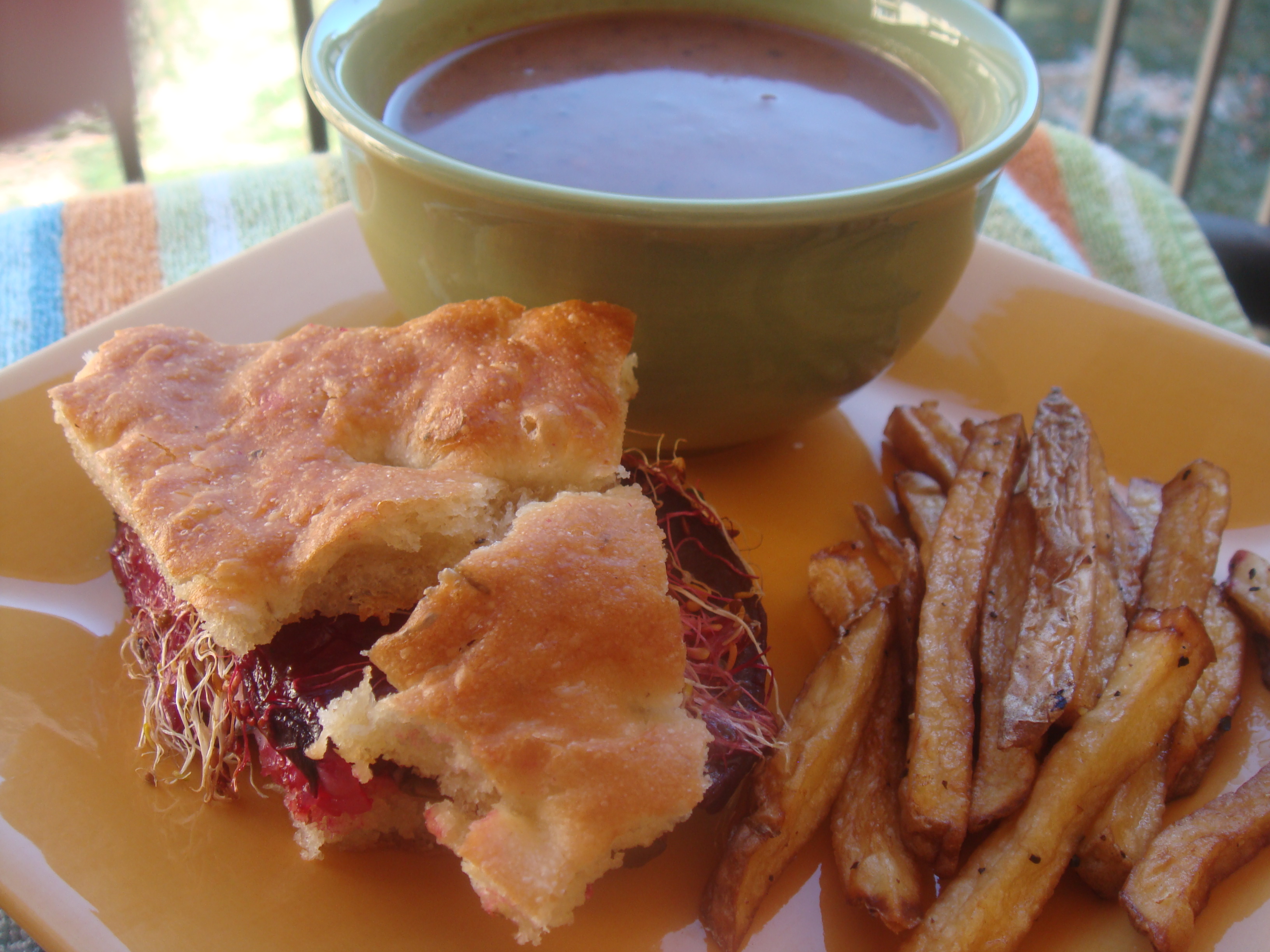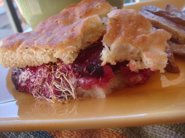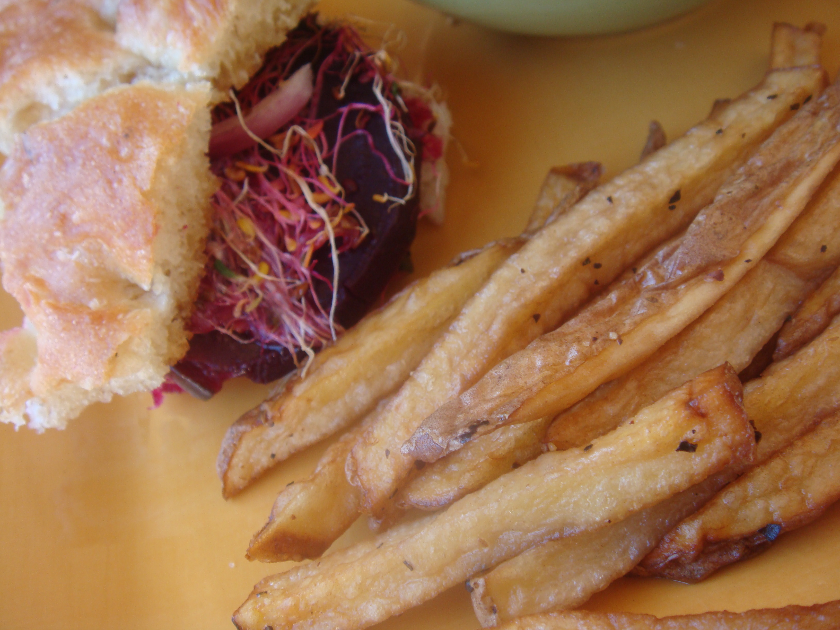 It’s a vegetarian restaurant with super clean and healthy tasting food.  I got “The Champ” — Freshly baked foccacia bread with layers of roasted beets, red onions, grilled zucchini, sprouts, swiss cheese, and lemon caper aioli — and loved it!