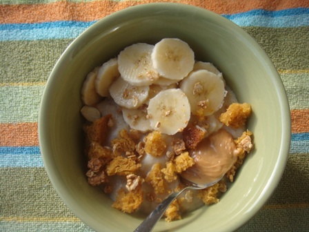 I haven’t had banana on top of my oats in a while, it was fun!  Also on top was peanut butter, pumpkin granola (new!) and some cake crumbs.  I’ll have to ask Hannah what kind of cake it was again but it sure was gooood 🙂