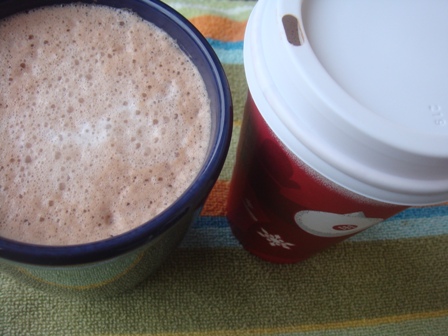 Okay, this looks a little extreme but really it was only one grande soy salted hot chocolate + espresso that I divided in two and added milk to each.  One for before work and one for later if I need it!