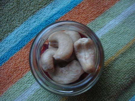 Cashews on top of dried cranberries on top of 2 dried apricots.