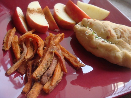 And a little ketchup.  No really, it was a little because I wasn’t exactly sure if I wanted any at all but I ended up dipping both the calzone and the fries in it.  I thought about dipping the apple but then I realized that would be disgusting.