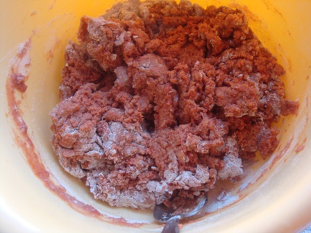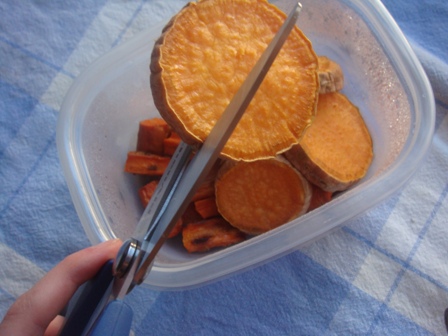 I mixed in some leftover roasted veggies. Doesn’t everyone use their kitchen shears to cut up sweet potato discs?