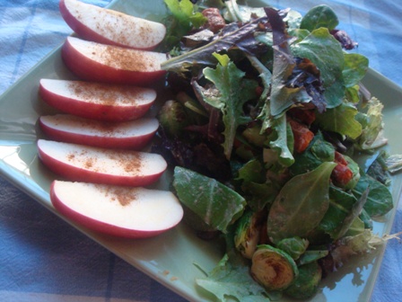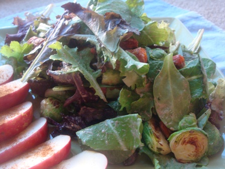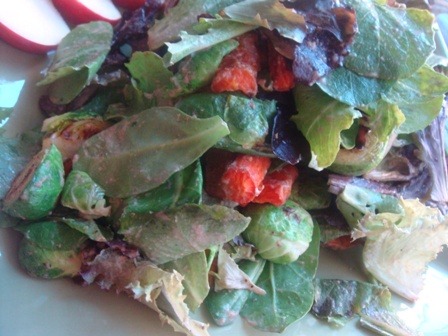 Roasted brussels, sweet potatoes and carrots went on top a bed of mixed organic greens.