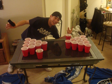 Yes, beer pong on a flat screen TV.  Don’t worry, it was completely broken and we were planning on throwing it away anyways.