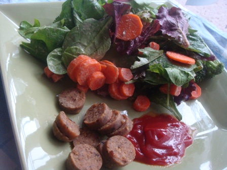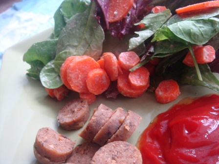 Field Roast Grain sausage & ketchup on the side.  Note to self: do not microwave sausage unless you enjoy eating shriveled food.