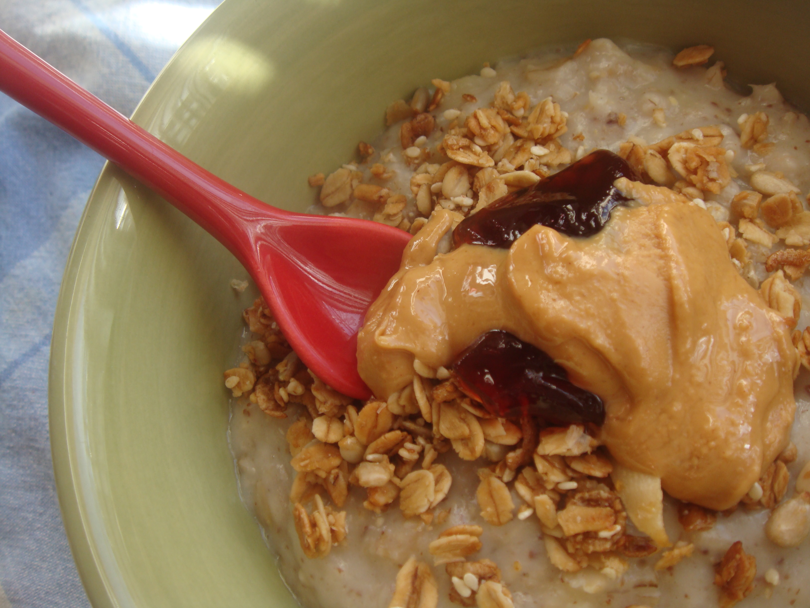Topped with granola, mixed berry compote and lots of peanut butter.  Okay, it looks like more than it really was because my homemade batch is super drippy.  I’m not complaining.