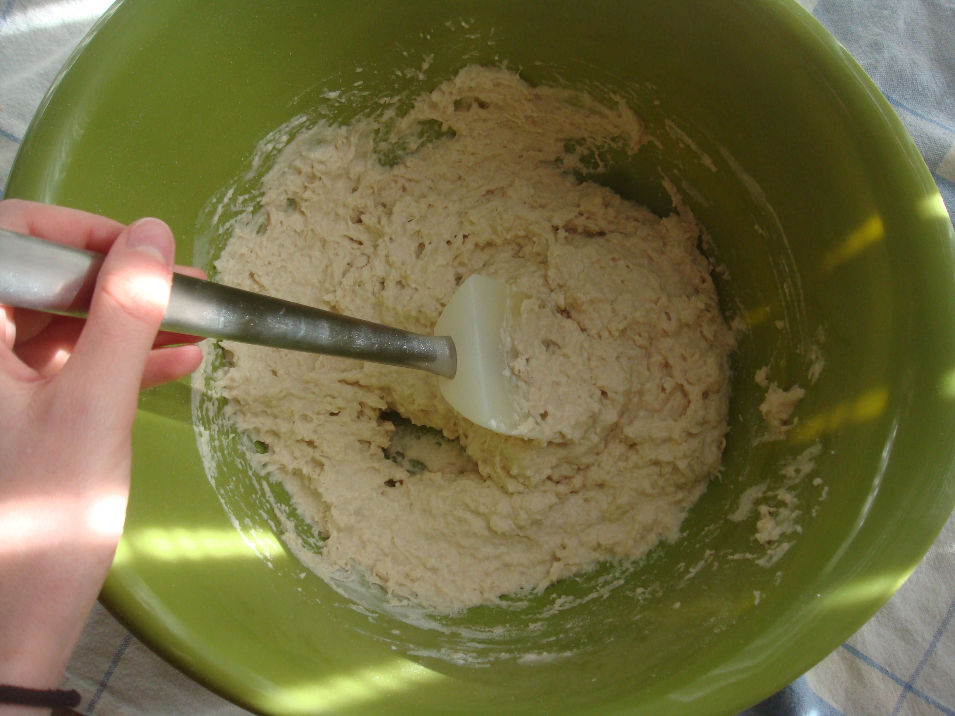 5. When you can no longer mix the dough, pour onto a floured surface and knead for 5 minutes or until smooth.