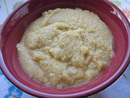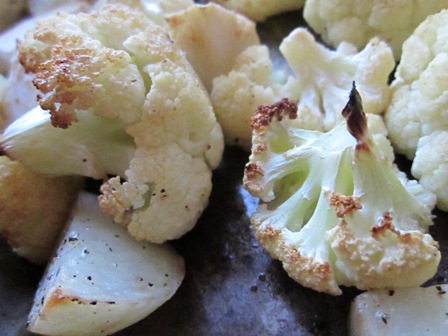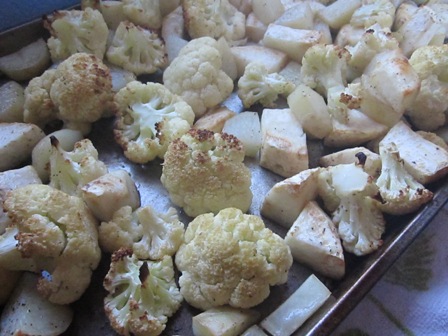 Try not to eat the whole pan of roasted cauliflower, potatoes and celery root.  Save some for the soup.