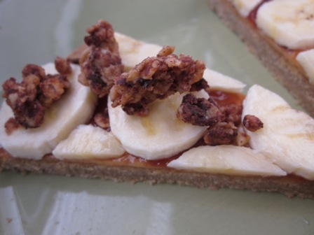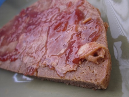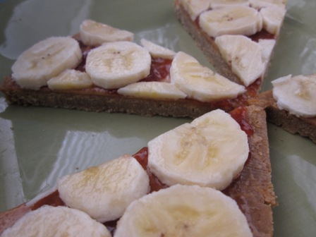 All I did to go from the above picture to breakfast pizza was cut the socca in half, then smear with peanut butter and jelly and top with what have you.