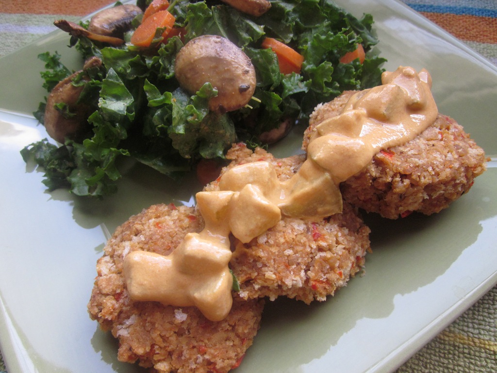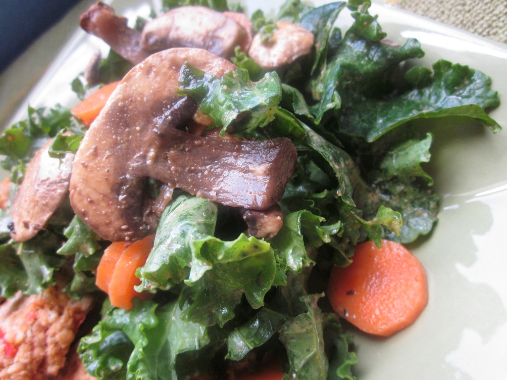We served our tempeh cakes with a kale salad, a la Mama Pea.  Topped with carrots and mushrooms.