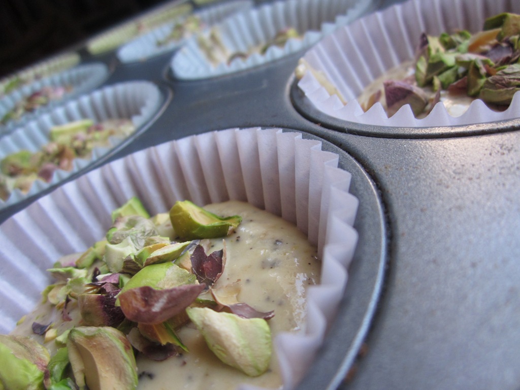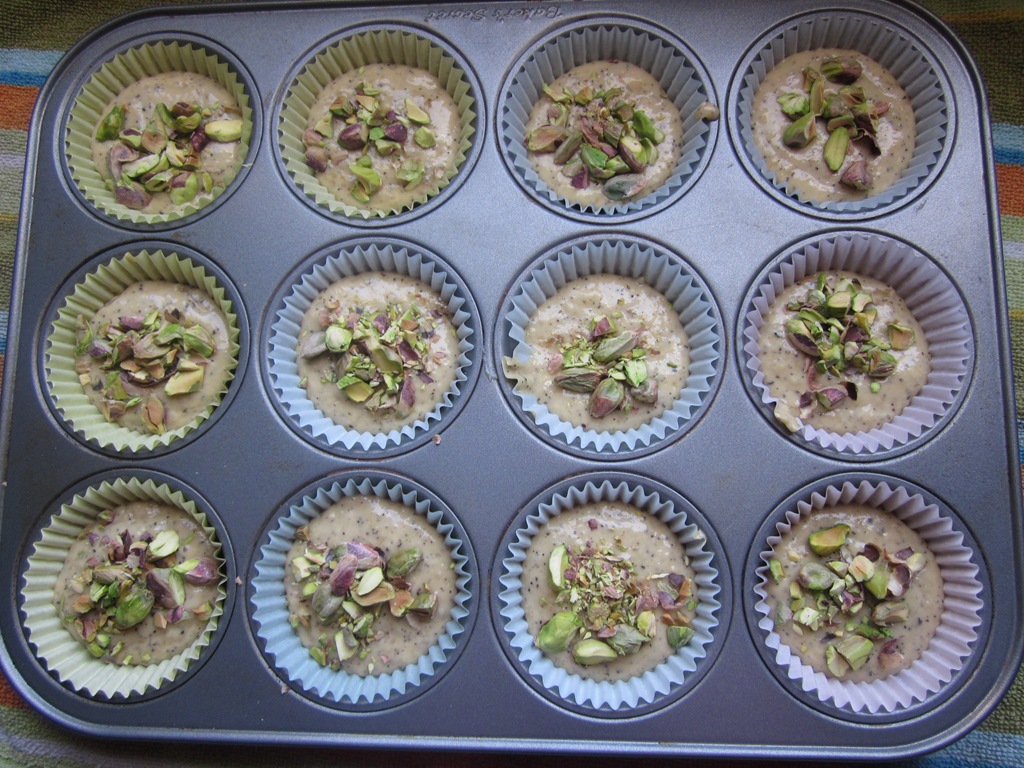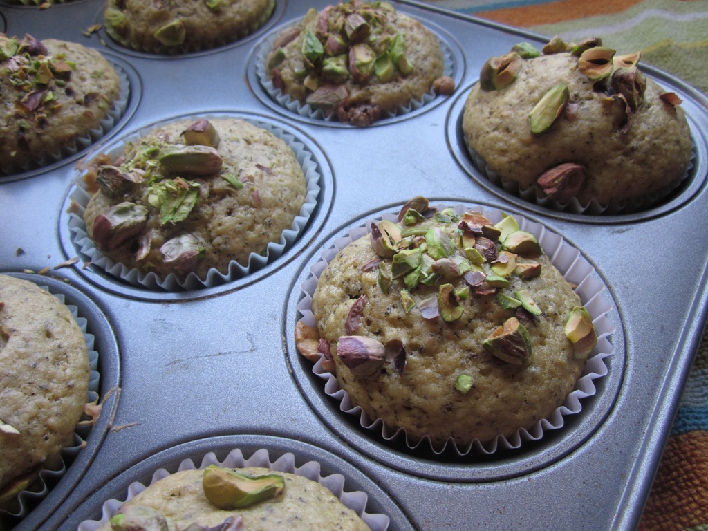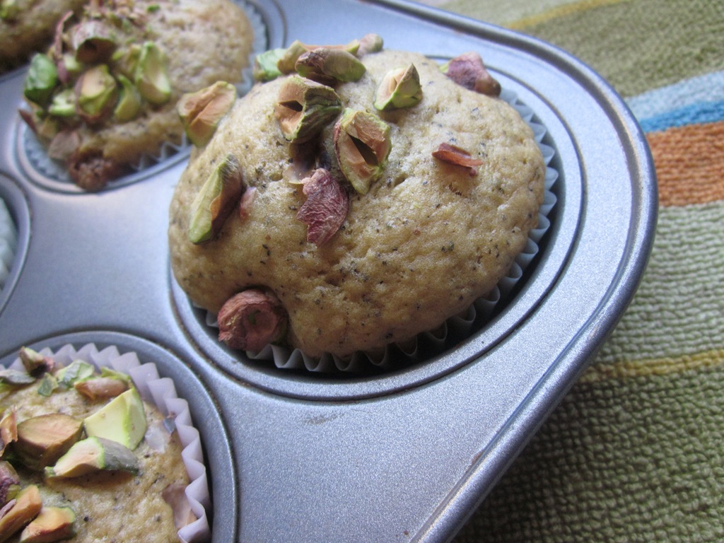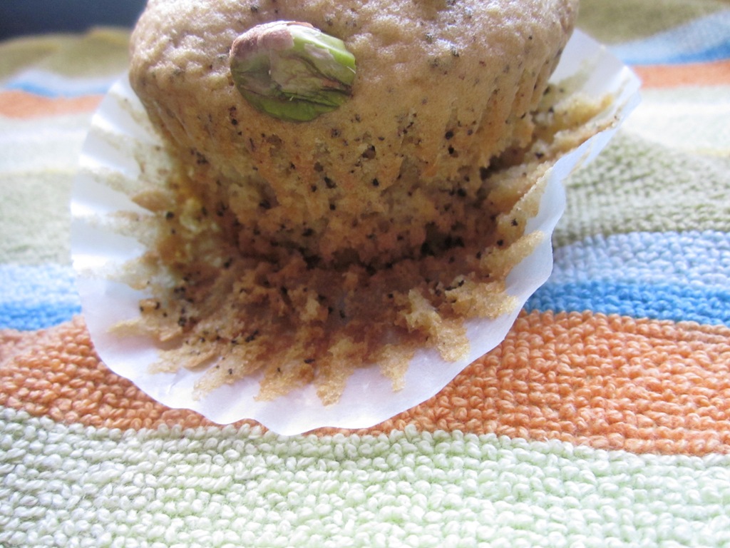 I saw the recipe for these muffins in Cooking Light and was ecstatic when I realized I had all the ingredients on hand. That wouldn’t normally be the case but it’s baseball season and Joey needed those pistachios. None of which he’s eaten since we bought them two weeks ago.