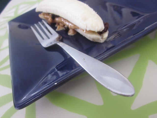 Sandwiching peanut butter and raisins between two halves of a banana.
