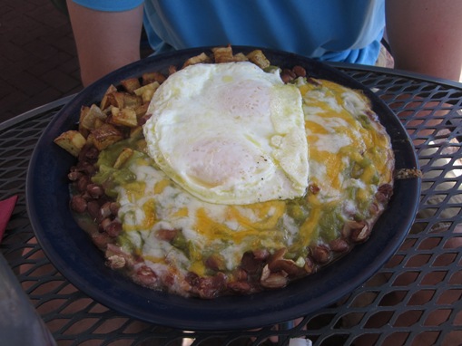 “Breakfast Tostadas: two crisp yellow corn tortillas cups filled with anasazi beans and spinach and mushrooms. Scrambled eggs on top. Served with home-cut potatoes and toast or muffin.”