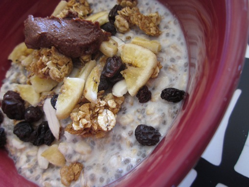Topped with granola, raisins, dried banana and chocolate hazelnut butta.