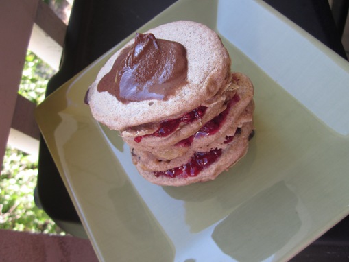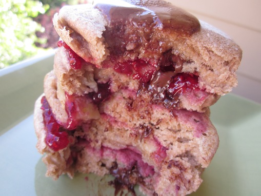 Chocolate chip banana pancake stack, layered with homemade jam and freezer jam alternately and topped with chocolate hazelnut butter and maple syrup.