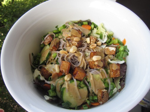 Except that I can’t follow directions and ended up making a few changes of my own that included adding soba noodles and using peanut butter instead of almond butter for the dressing. What can I say, I’m cheap.