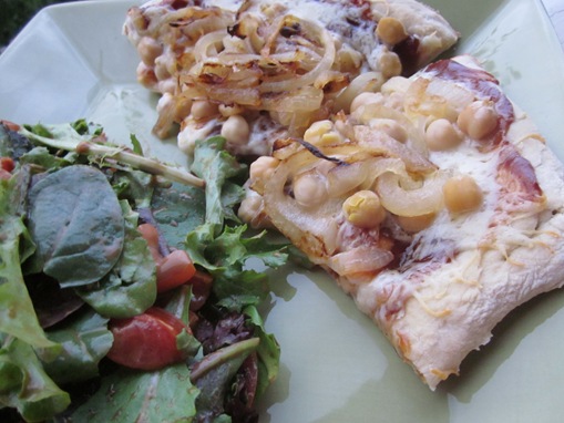 Seriously, all I did was pre-bake the crust, spread some BBQ sauce on, then cheese, chickpeas and some onions I’d caramelized on the stove.
